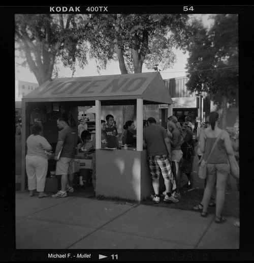 Each camera started with an image taken by Westmark somewhere on the fairgrounds that morning and each camera had a corresponding log book with a one sentence description of the first image. Each additional participant took a photo that responded to that sentence in some way and then logged a sentence of their own about the photo they took, and so on and so forth until we finished each roll of film. One-hundred-and-fifteen people participated in the project over the course of twelve hours. The images are printed in the form of contact sheets with photo credit given to those who participated, they are available for view on Facebook (fan page: The Telephone Booth).
